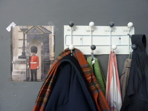 Die Halle wird von einer Offsetdruckmaschine (grau) und Abluftrohren (silbergrau) dominiert, ganz hinten an der Wand hängt ein Selbstportrait Van Goghs (grün und blau, orange und gelb), und an den Seitenwänden Plakate von Frauen (Gesicht, Busen, Rücken, Po und Beine), neben einer Waschrinne mit drei Armaturen unter einem Durch-lauferhitzer das Foto eines britischen Wachsoldaten mit Bärenfellmütze (schwarz und rot), die Aufhänger daneben sind beschriftet: PETER, MICHI, GESCHIRR, GÄSTE – ich hänge meinen Mantel über das Gästehandtuch – Bitte während dem Druck nicht mit dem Drucker sprechen – auf den Stufen einer Wartungsbrücke zwischen den nach Farben geordneten Teilen der HEIDELBERG Speedmaster liegt ein Paar roter Plastikhandschuhe mit schwarzen Flecken neben einem schwarzbraunen Fetzen und unter der Wanduhr über der ORIGINAL HEIDELBERG hängt ein Schwarzweiß-Plakat, das mir noch in Erinnerung ist, die Installation im Süd-bahnhof vor seinem Abriss: EINEN AUGENBLICK ZEIT. Jetzt liegt meine flugschrift auf dem Scanner mit Tastatur und Monitor, an der Wand über der digitalen Werk¬bank, auf der jetzt die flugschrift