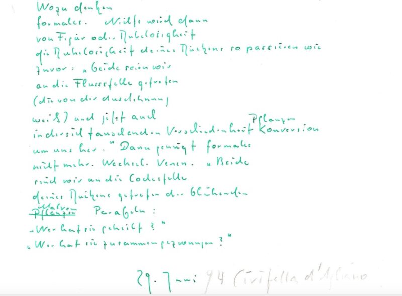 Und es sind die Feuer des Turmes, die durch die Tiefen und Untiefen auf See und Land sowie der eigenen Seelenlandschaft leiten. Alltägliche Empfindungen verweben sich mit Geschichten des Ortes. Dunkelsektoren, die Perspektiven, an denen die Lichter nicht zu sehen sind, werden nicht ausgespart. Sprachspiele gehen einher mit immer neuen Lese- und Entfaltungsmöglichkeiten dieses Hybridformates zwischen Folder, Poster und Zeitschrift, als das sich die „flugschrift“ gibt. Am Ende schließt sich der Bogen durch Farbspiele, die so etwas wie einen Faden in die poetische Abhandlung bringen.